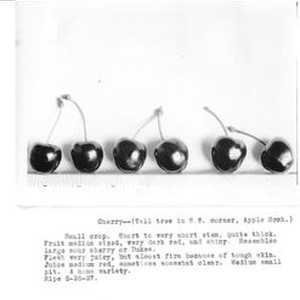 Identification of Luther Burbank cherry hybrid from the Gold Ridge Experiment Farm--single cherries (tall tree in S.W. corner, apple orchard), ripe May 28, 1927