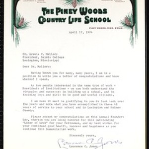 Laurence C. Jones (Piney Woods Country Life School), Piney Woods, Mississippi, letter, 1974 April 17, to Arenia C. Mallory (Saints College), Lexington, Mississippi. [Description English/roman)]