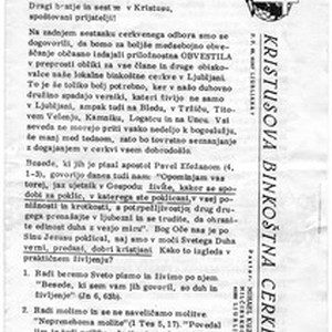 Bilten Kristove pentekostalne crkve u Ljubljani. Broj iz rujna 1987. godine koji sadrži kratak uvodnik, a zatim izvješća o tome što se događalo u crkvi tijekom ljeta i obavijesti o tome što će se događati u crkvi tijekom rujna i listopada. [Description (original non-English/roman language/script)] Bulletin of the Christ's Pentecostal Church in Ljubljana for September 1987, containing an editorial, report on what went on in the church during summer and the notices what will be been happening in the church in September and October. [Description English/roman)]