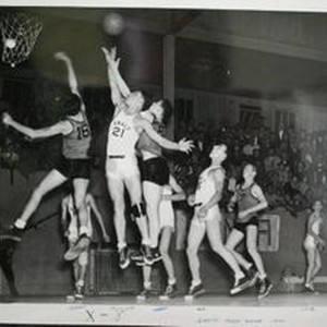 Photo--black and white: Analy High School Tigers basketball 1949. Analy vs Santa Rosa. Players identified: Kimura, George (14) Perry, Ronnie (21) Gus (possibly Gorlick, Gene) (15) Dower, Herb (13). Analy 33--Santa Rosa 19
