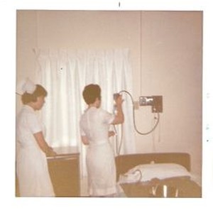 Photo--demonstration of wall suction 1969, Palm Drive Hospital. Two unidentified nurses shown.