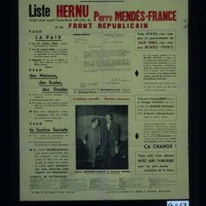 Elections legislatives du 2 janvier 1956 - 6e secteur Seine. Liste Radical-Socialiste et d'Union pour le progres et la renovation du pays. Liste Hernu. Seule liste ayant l'investiture officielle de Pierre Mendes-France et du Front republicain