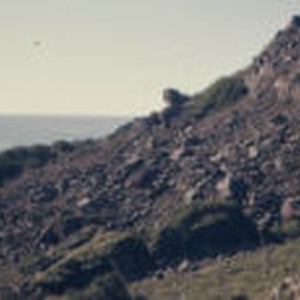 California laurel trees grow on a rocky hillside overlooking the ocean.
