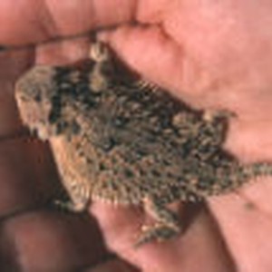 Close-up of a hand-held pygmy horned lizard.