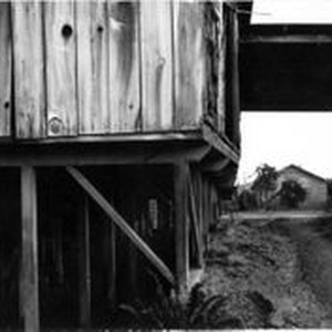 Photo--black and white Fruit dryer and packinghouse in west Sebastopol, CA. A driveway is seen between the dryer and a metal sided building.