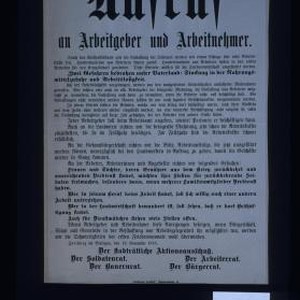 Aufruf an Arbeitgeber und Arbeitnehmer .... Zwei Gefahren bedrohen unser Vaterland: Stockung in der Nahrungsmittelzufuhr und Arbeitslosigkeit ... Freiburg im Breisgau, den 19. November 1918. Der Stadtratliche Aktionsauschutz; Der Soldatenrat; Der Arbeiterrat; Der Bauernrat; Der Burgerrat
