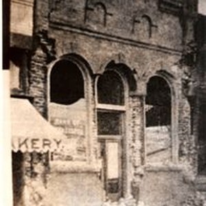 B/W photo, Bank of Sebastopol building next to bakery on Main Street, Sebastopol (possibly after 1906 Earthquake--rubble and broken windows.)