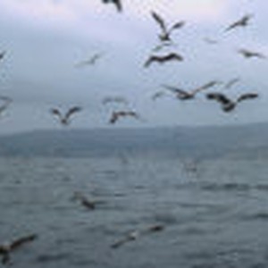 A brown pelican and a flock of gulls off the coast of the Palos Verdes Peninsula.