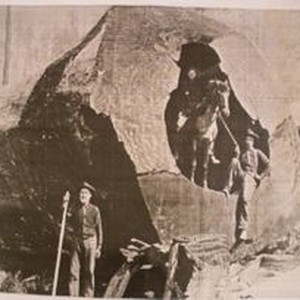 Photo--black and white: Horse and rider standing in fallen tree--logging Mendocino County.