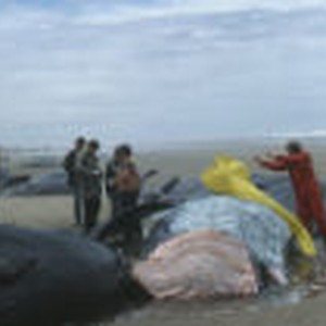 Green peace person putting colorful sheets over a whale. Bruce Mate and Mike Graybill are standing off to the side.