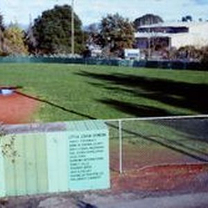 Print, color: Sebastopol's Ives Park. Previously was the city's camp grounds. Park grounds and pool donated by Mrs. Ives. The Little League softball field is seen and the Veterans Memorial Auditorium in the background. Circa 1970.