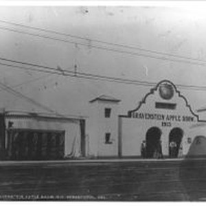 Photo -black and white: the 1913 Gravenstein Apple Show entrance on Main Street Sebastopol. The facade is made to look like a building with "towers" on either side which were used as the ticket windows. The large white tent is visible behind the entrance.