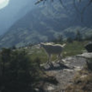 A goat on a rocky ridge among green vegetation on Hidden Lake Trail.