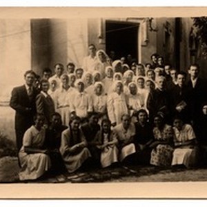 Fotografija članova crkve s krštenicima, okupljeni ispred zgrade oko 1953. godine i bez drugih podataka. [Description (original non-English/roman language/script)] Photograph of church memebers with the ones to be baptized, gathered in front of a building around 1953 without any further details. [Description English/roman)]