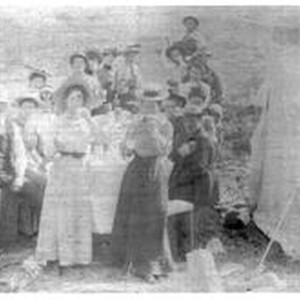 Photo--black and white, matted: A group of young people on a camping trip at the Russian River circa 1900. A canvas tent is set up and the people are eating around a table. .