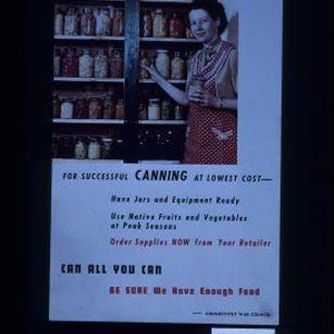 For successful canning at lowest cost - have jars and equipment ready. Use native fruits and vegetables at peak seasons. Order supplies now from your retailer. Can all you can. Be sure we have enough food