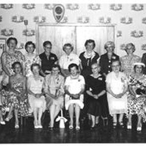 Photo--black and white: Ladies of the Analy Union High School 1925 class reunion possibly in 1955. Bottom row, L-R: Parkinson, L.C. Best; Dowe, Margaret Covert; Abbott, Grace Winkler; Talbot, Georgia Williams; Bulman, Dorothy Osborne; Herring, Georgia Bower; Snypp, Edith; Selna, Miss; Michie, Lucille Dampier; Top row, L-R: Burton, Estelle Hill; Barnes, Lillian Teaderman; Thompson, Milicent Sinclair; Backholm, Freda Harmon; Farmer, Greida Lohman; Nelson, Emma Broderson; Greene, Dorothy Widdoes; Hurst, Margaret Myland; Park, Ruth Lunceford. Photography by Donald Duckhorn 232 Maple Avenue, Sebastopol
