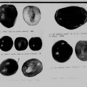 Photo, black and white: Burbank Plums September 8th. Five different plums, each with caption.
