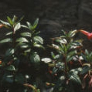 Bush with red flowers and dark green leaves grows at Pelican Bay.
