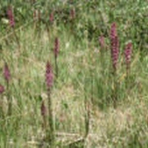Long stems with clusters of pink flowers grow in a field of grass at Sunset View Meadow.