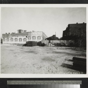View of buildings backing up to a vacant dirt lot north of Apablasa Street and east of Alameda Street near Old Chinatown, Los Angeles. There is advertising on the wall of one of the buildings and billboards along a fence. Lumber is stacked in the lot. Title transcribed from photograph. Note: The street name of "Apalabasa" is spelled incorrectly on the photograph, the correct spelling is "Apablasa".