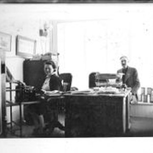 Photo--J. F. Triggs & Son Auto parts store at 130 South Main Street, Sebastopol. Triggs is seated behind the desk and Bernice Herring is at the typewriter. 1939