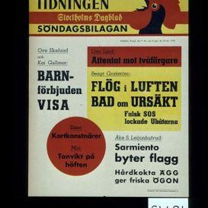 Sondagsbilagan. Ove Eklund and Kari Gullmar: Barnforbjuden visa. Lisa Lind: Attentant mot tvafargare. Bengt Grafstrom: Flog i luften bad om ursakt. ... Esset : Kortkonstnarer. Ake S. Leijonhufved: Sarmiento byter flagg