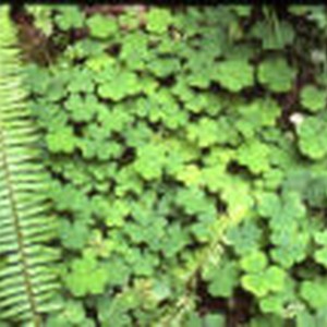 Close-up of carpet of three-leaved green plants with a branch of another plant to the left.