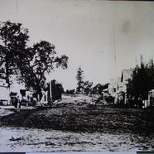 Photo--black and white Oldest known photo of main street Sebastopol, 1874. Wooden buildings line both sides of dirt street with several people standing. Buggies and horses also seen.