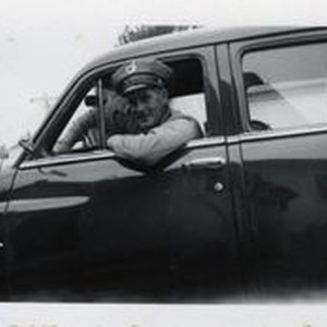 Photo--black and white: Sebastopol Police Officer Lemual "Shorty" Plumley in uniform in a dark car looking out the window at the photographer.