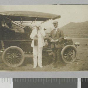 Jack London, wearing a white suit and holding a camera, and and unidentified man stand in front of automobile. Title and date transcribed from envelope.