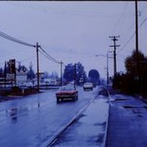 Slide--color: Gravenstein Highway south looking north in Sebastopol. P. Beck Realty, TV Center, Fircrest Market, and Bowling Alley sign. 1970.