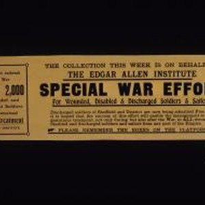 Since the outbreak of war, over 2,000 wounded and disabled soldiers have received free treatment at the Institute. The collection this week is on behalf of the Edgar Allen Institute. Special war effort for wounded, disabled and discharged soldiers and sailors ... Please remember the boxes on the platform
