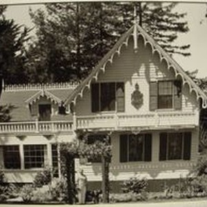 Photo -black and white: The two-story Corey House in Bloomfield. Photo taken in 1976 of the two-story white clapboard gingerbread house. Ron Chamberlain Photographer .