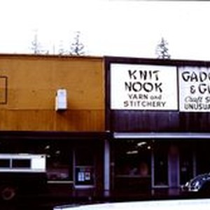 Slide, color transparency: Downtown Sebastopol, 1977. The Unique Boutique store front next to Knit Nook and Gadgets and Gifts.
