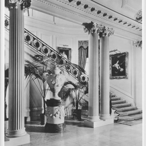 The entranceway with the main staircase. The painting on the left is after Sir Henry Raeburn, Lady Elizabeth Crichton, later Viscountess Mount-Stuart (circa 1791). On the right is Sir Thomas Lawrence's The Hon. Emma (Crewe) Cunliffe, later Emma Cunliffe-Offley (1809-1830). In white, on the lower right hand corner: "Keystone L.A." MS note on verso reads "HEH residence as art gallery: staircase." Stamp on verso reads "This Photograph is made for the Huntington Library and Art Gallery by Keystone Photo Service, Los Angeles."