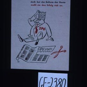CDU/CSU schafft Fundamente, S P D tat nichts daran, doch bei der Reform der Rente masst sie den Erfolg sich an. [Verso:] Tatsachenzahlen ...Die Renten sind durchschnittlich um 60% erhoht. ...Keine Experimente! ...CSU wahlen