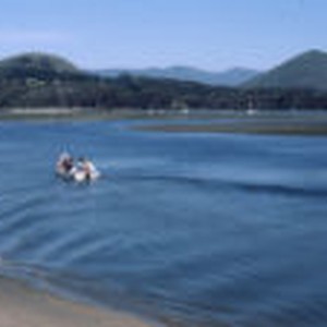 A group of students ride out from shore in a small boat onto Morro Bay with, sailboats and mountains in the background.