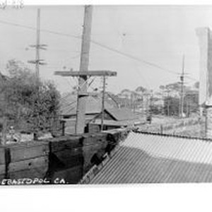 Photo--black and white: View of the P&SR railway over rooftops circa 1920. West on Main.