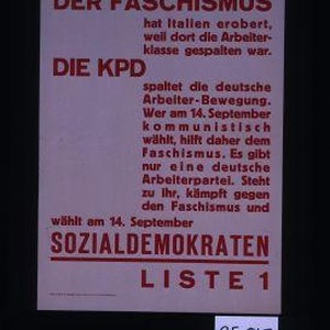 Der Faschismus hat Italien erobert, weil dort die Arbeiterklasse gespalten war. Die KPD spaltet die deutsche Arbeiterbewegung. Wer am 14. September kommunistisch wahlt, hilft daher dem Faschismus ... Wahlt ... Sozialdemokraten Liste 1