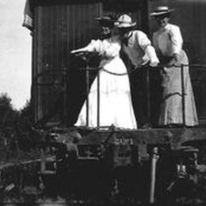 Photo--black and white: P&SR passenger car with man and two women at the back door. One woman is turning a wheel. Circa 1904. The man is possibly Stan Strout.