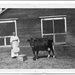 Photo, black and white: Louisa Neta (Pearson) Hallberg and pet cow 1927 on the Hallberg farm on Oak Grove Avenue, Graton. Louisa was the wife of John Francis Hallberg (m. 1885). The Hallbergs were the parents of Alfred Hallberg, Ida Hallberg Rued and Oscar Hallberg.