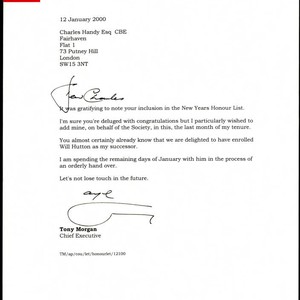 Letter of correspondence from Tony Morgan to Charles Handy congratulating Handy on his inclusion in the New Years Honour List. Morgan acknowledges that while Handy is deluged with congratulations, he particularly wanted to add his own, on behalf of the Society. He proceeds to inform Handy that Will Hutton will take over as his successor at the Society, and that he will be spending the remaining days of January with him for the hand over.