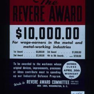 The Revere Award ... for wage-earners in the metal and metal-working industries. ... To be awarded to the workmen whose original devices, improvements, processes or ideas contribute most to speeding up our Industrial Defense Program