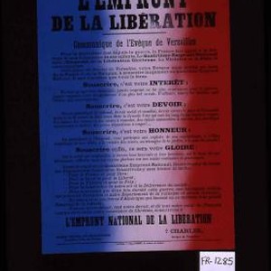 L'emprunt de la liberation. Communique de l'eveque de Versailles. Pour la quatrieme fois depuis la guerre, la France fait appel a la fortune et aux economies de ses enfants. Le quatrieme emprunt national sera l'emprunt de la liberation glorieuse. La victoire et la paix le couronneront. ... Souscrire, c'est votre interet ... Souscrire, c'est votre devoir ... Souscrire, c'est votre honneur ... Souscrire enfin, ce sera votre gloire