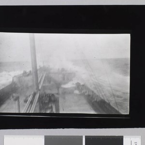 Bow of the ship Mexicano at sea. Title and date devised by cataloger. Copy print of original. Jack and Charmian London took the Mexicano from Veracruz to Tampico Mexico in May of 1914.