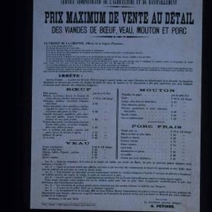Republique francaise - Prefecture de la Gironde. Service administratif de l'agriculture et du ravitaillement. Prix maximum de vente au detail des viandes de boeuf, veau, mouton et porc ... 24 aout 1918