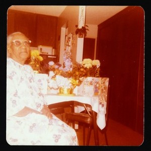 Photograph of an unidentified woman in a kitchen, [s.d.]. "I want you to have this, to carry and show to all my sweet friends, that I labored with down through the years" -- written on back. [Description English/roman)]