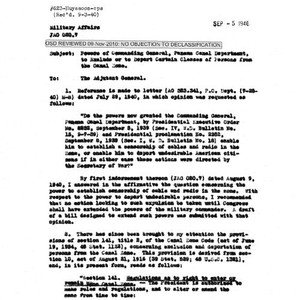 Image / Gullion memo regarding powers of commanding general, Panama Canal Department, to exclude …