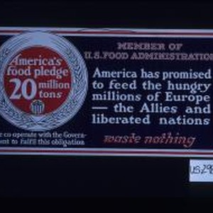 Member of U.S. Food Administration. America has promised to feed the hungry millions of Europe - the Allies and the liberated nations. Waste nothing. America's pledge 20 million tons. We cooperate with the Government to fulfil this obligation